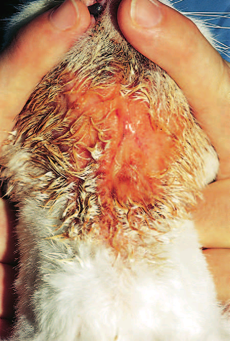 Фото 6. Пиотравматический дерматит собак и кошек. Выраженное эрозивное поражение с экссудатом в области вентральной части шеи у кошки с пищевой аллергией.