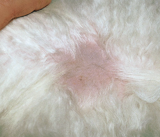 Фокальная алопеция встречается через 3-6 месяцев после иньекции вакцины от бешенства. Зоны кожи, окаймляющие место иньекции, становятся гиперпигментированными и облысевшими и могут иметь размеры 2-10 см в диаметре. В редких случаях у животных может появляться депрессия, летаргия и лихорадка и развиваться алопеция на морде, лапах, краях ушных раковин и кончике хвоста. Могут появляться эрозии и язвы на языке, подушечках лап, локтях и коже латерального угла глаза. В тяжелых случаях отмечено фокальное снижение массы мышц. Поражения могут усиливаться после ревакцинации. Подкожные иньекции суспензии прогестагенов также могут приводить к фокальной алопеции. Реакции после иньекции прогестагена также встречаются в месте иньекции, хотя имеют тенденцию развиваться на дорсальной средней линии в межлопаточном регионе. (Фото 1).