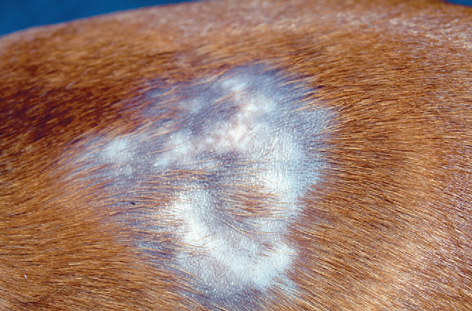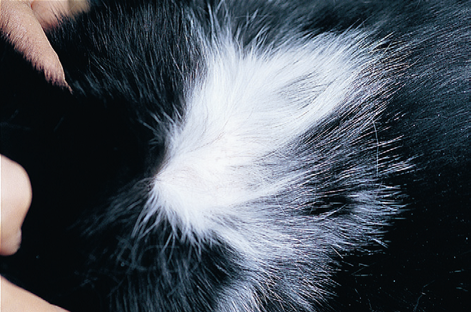 Фото 5 Иньекционная реакция. Фокальная зона белой шерсти (лейкотрихия), быстро развившаяся после иньекции стероида.