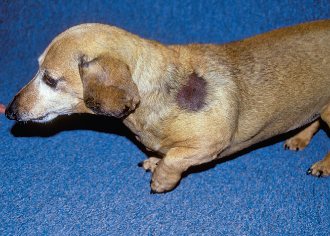 Фото 3 Иньекционная реакция. Та же собака с фото 2. Очевидна фокальная зона алопеции и гиперпигментации. Отсутствует язвенный васкулит и вторичная инфекция.