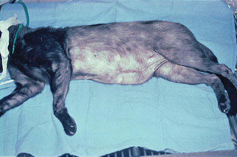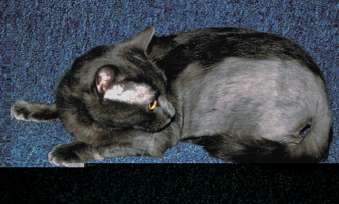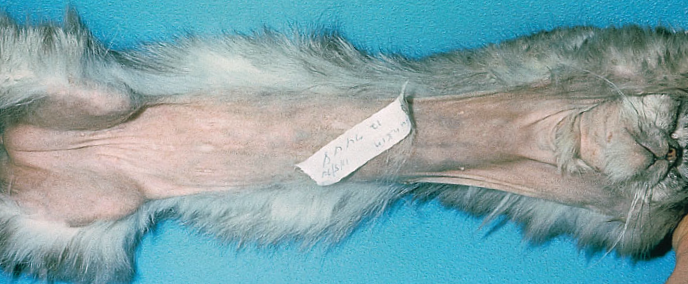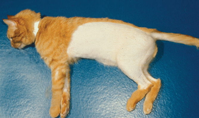 Фото 3 Психогенная алопеция кошек. Алопеция на латеральных частях туловища, вызванная чрезмерным грумингом. Кошке было трудно дотянуться до дорсальной средней линии, поэтому она осталась неповрежденной.