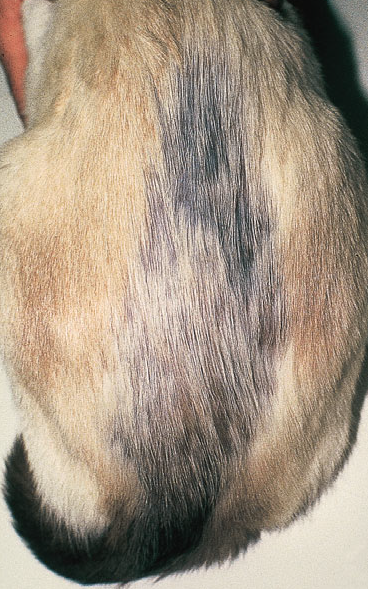 Фото 1 Психогенная алопеция кошек. Симметричная алопеция в люмбосакральном регионе у сиамской кошки. Обратите внимание на акромеланизм.