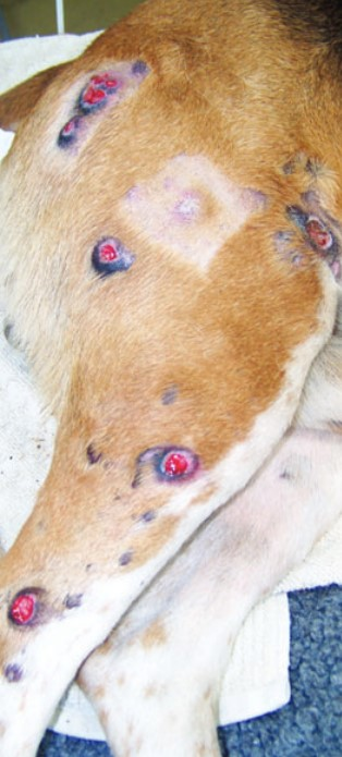 Синдром лепроидной гранулемы у собак проявляется в виде единичных или множественных четко очерченных твердых подкожных узелков диаметром от 2 мм до 5 см. Очаги поражения безболезненны и не вызывают зуда, иногда с алопецией, и они могут изъязвляться, если они очень большие. Узелки чаще всего обнаруживаются на голове и дорсальных ушных складках, но могут появляться на любом участке тела. Пораженные собаки в остальном здоровы и не имеют системных заболеваний.