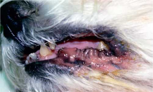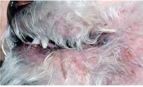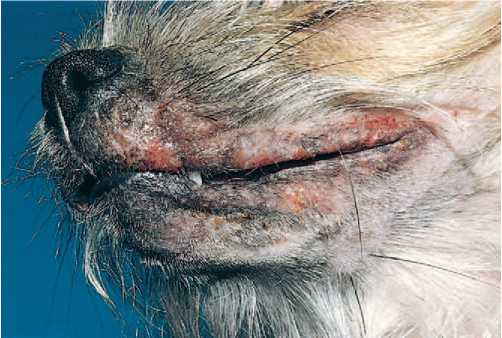Фото 1 Слизистокожная пиодермия собак. Острый периоральный дерматит у этого терьера был интенсивно зудящим. Вокруг слизистокожного соединения видны алопеция, эритема и эрозии.