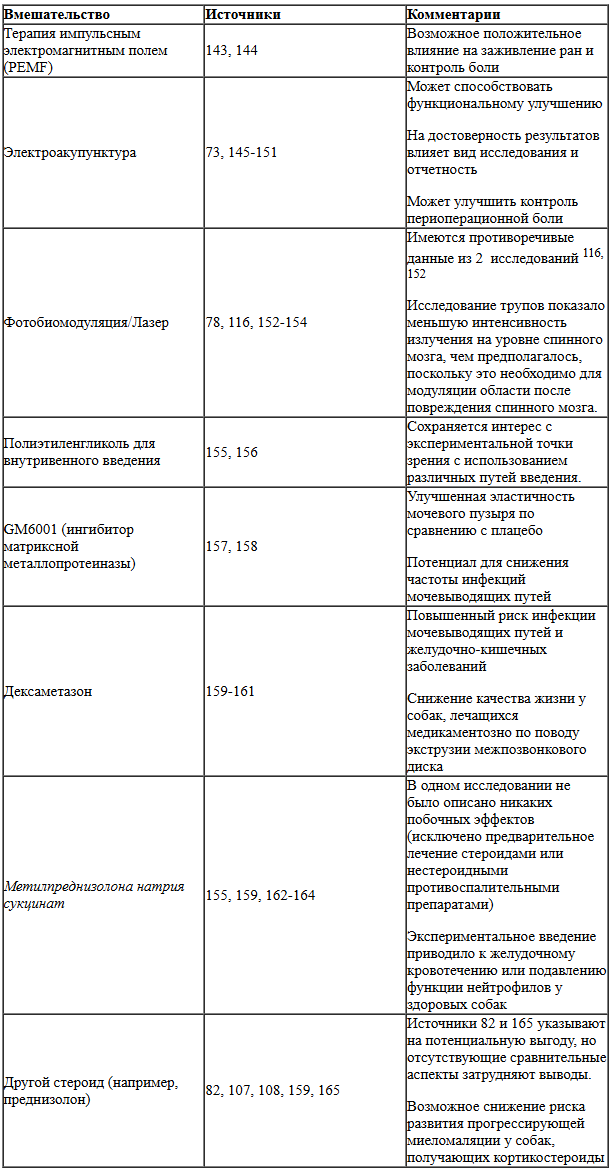 Оценка методов лечения на основе клеток рассматривалась вне рамок этого обсуждения. Было предложено множество нейропротекторных стратегий для смягчения вторичного повреждения или содействия восстановлению функции нейронов или функциональной связности. Подмножество этих стратегий, оцененных в ветеринарных клинических условиях, имеет доказательства, свидетельствующие о недостаточной эффективности для улучшения двигательных результатов (таблица 5); поэтому их стандартное использование в настоящее время не рекомендуется.