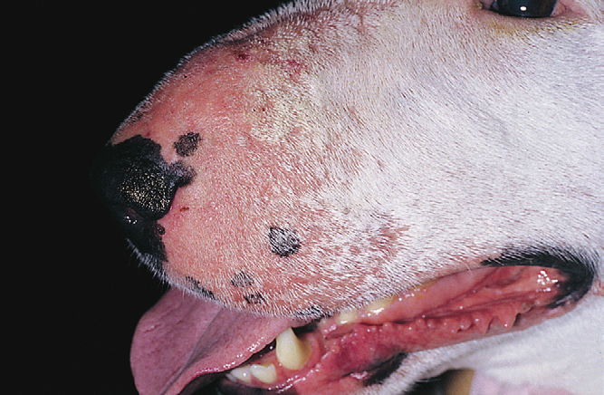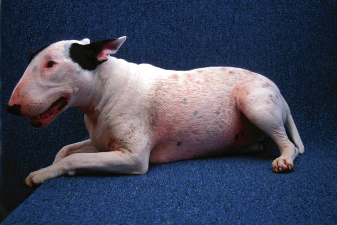 Фото 1 Солнечный дерматоз собак. Генерализованная алопеция и эритема, захватывающие морду и туловище у бультерьера.
