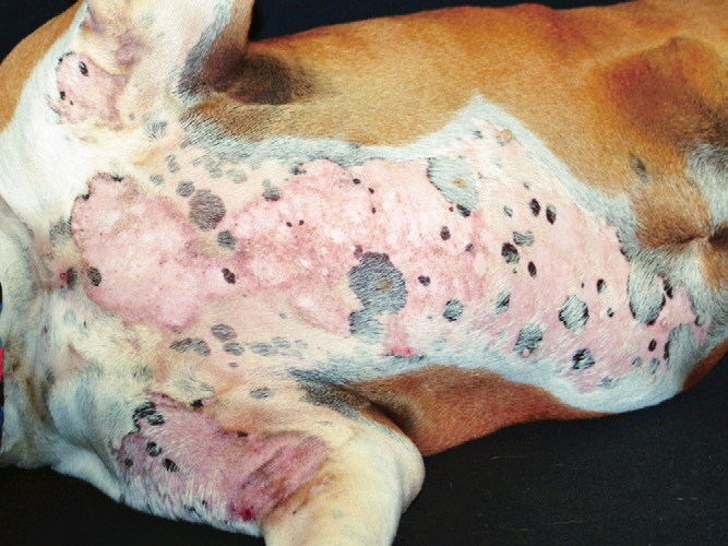 Фото 8 Солнечный дерматоз собак. Вид живота собаки с солнечным дерматитом. Обратите внимание, что пигментированные регионы кажутся атрофичными. Эта иллюзия вызвана отечностью непигментированной кожи.