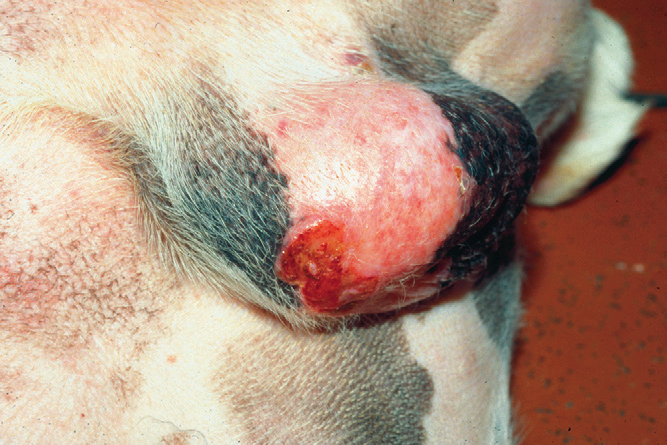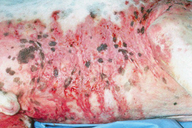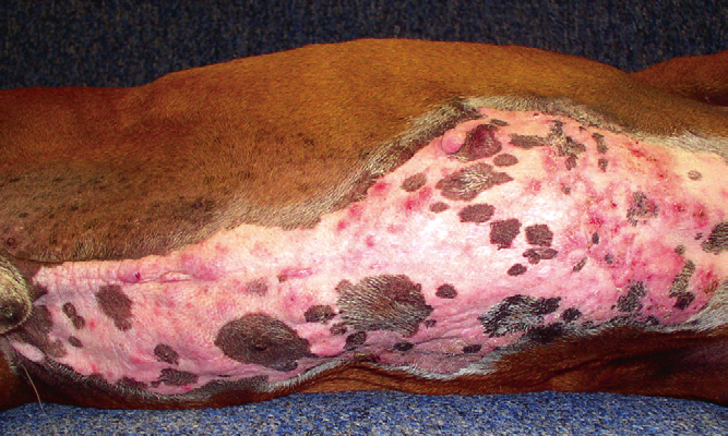 Фото 5 Солнечный дерматоз собак. Генерализованный солнечный дерматит вентральной части туловища у боксера. Кожа эритематозна и отечна, с фокальными зонами рубцевания. Очевидны многочисленные изьязвленные узелки, которые могут быть плоскоклеточным раком.