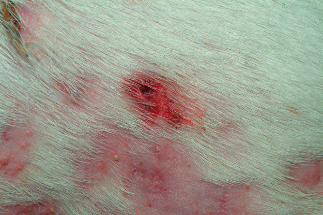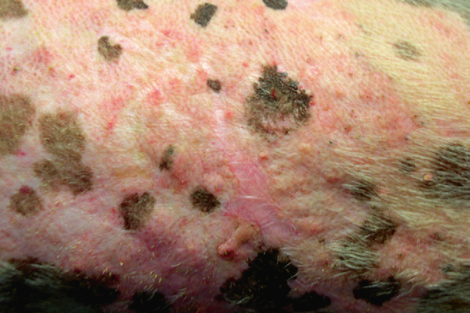 Фото 4 Солнечный дерматоз собак. Фокальная зона солнечного дерматита, демонстрирующая эритематозную кожу с алопецией. Обратите внимание, что волосяные фолликулы частично закупорены, формируя комедоны, которые могут стать воспаленными или вторично инфицированными.