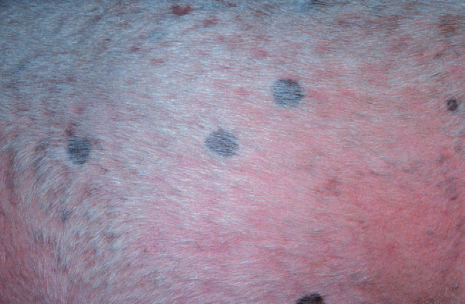 Фото 3 Солнечный дерматоз собак. Вид боковой части грудной клетки собак с солнечным дерматозом. Кожа эритематозна с алопеций типа «поеденная молью». Пигментированные зоны могут выглядеть атрофичными, что является иллюзией, вызванной припуханием окружающей непигментированной кожи.