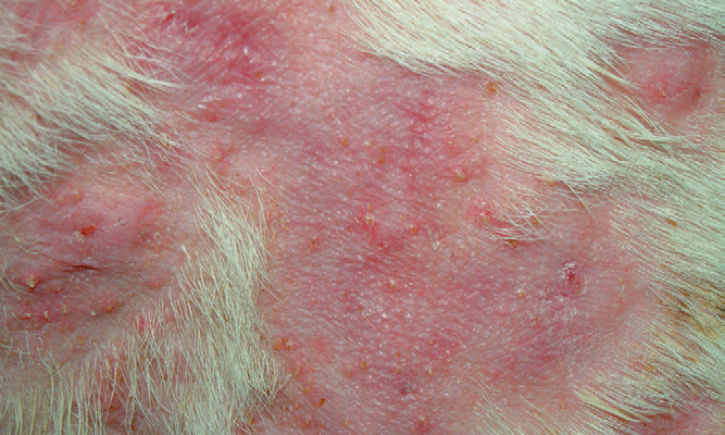 Фото 10 Солнечный дерматоз собак. Тяжелый эритематозный дерматит со сливающейся папулярной сыпью, вызванный инсоляцией.