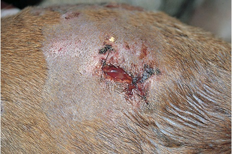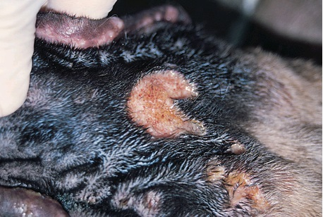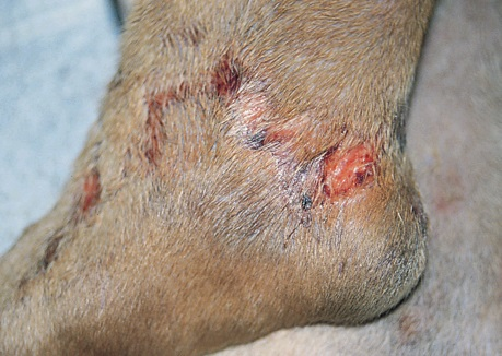 Кожные поражения могут включать незаживающие колотые раны, абсцессы, целлюлит, узелки с корочками, изьязвления, свищевые ходы с гнойным отделяемым и иногда тканевой некроз. Поражения обычно находятся на голове, дистальных частях конечностей или основании хвоста. Одновременно может иметься летаргия, депрессия, анорексия и лихорадка. Диссеминирование наблюдается часто.