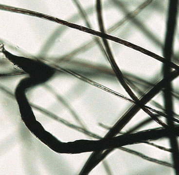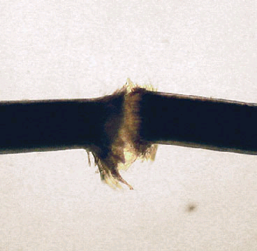 Фото 5. Узловатый трихорексис в выдернутом волосе у кошки с анагеновым облысением.