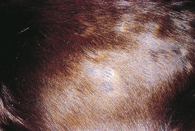 Диффузное облысение наблюдается тогда, когда животное теряет шерсть не мозаичным способом, а выпадает большая часть шерсти одновременно в отсутствие системной причины, с преходящей диффузной, частичным облысением, предшествующим нормальному повторному росту волос.