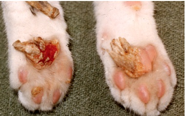 Фото 4 Вирусная лейкемия кошек. Множественные кожные рога на подушечках пальцев у кошки с вирусной лейкемией.