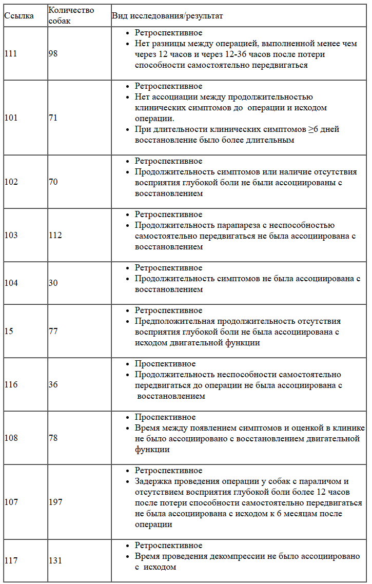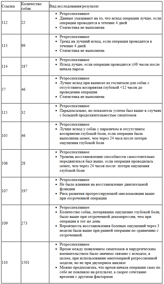 - Примечание : В литературе представлены противоречивые данные относительно влияния сроков хирургической декомпрессии на исход у собак с менее тяжелыми травмами, где преобладание более крупных и недавних исследований указывает на отсутствие связи.