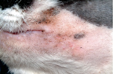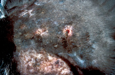 Фото 3. Заболевание Боуэена у собак и кошек. Мультифокальные пигментные поражения. Распостраненность этих поражений можно легко не определить, если не удалить волосы.
